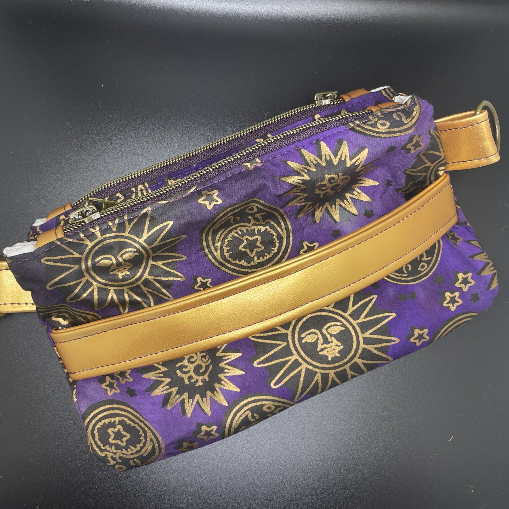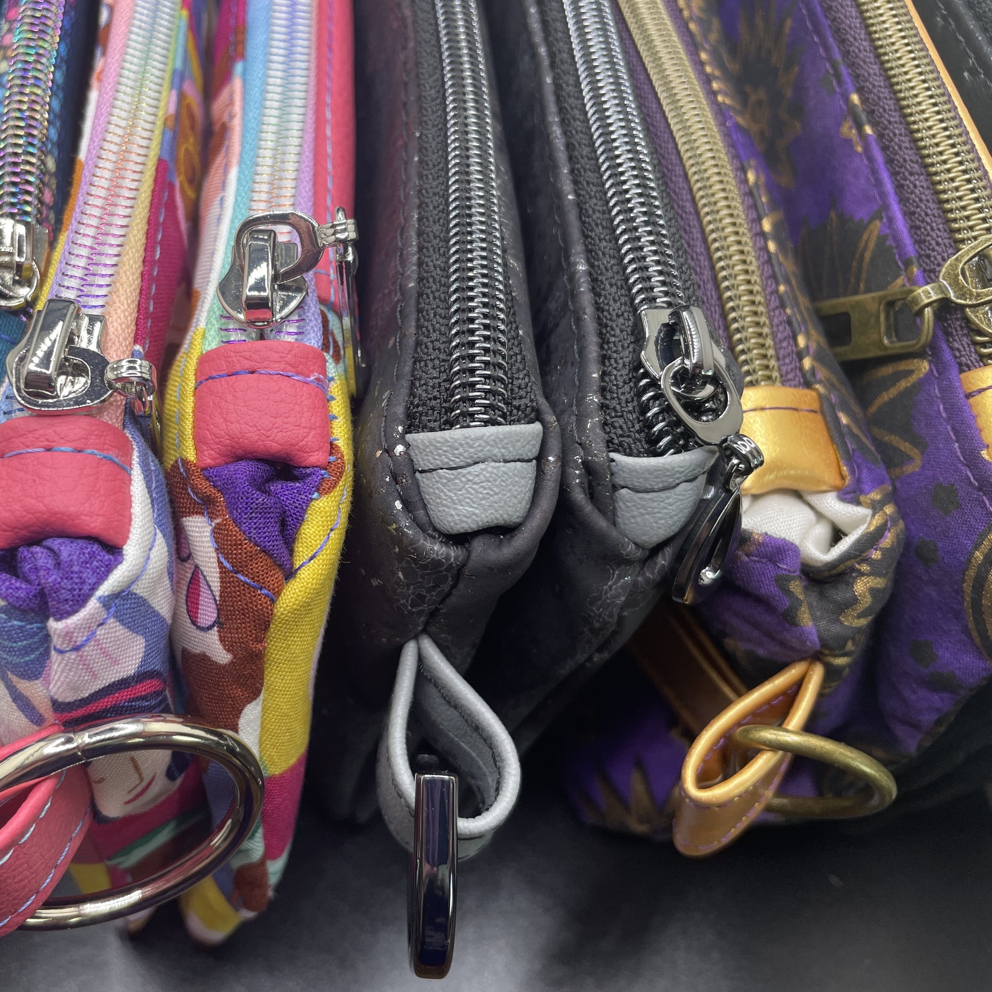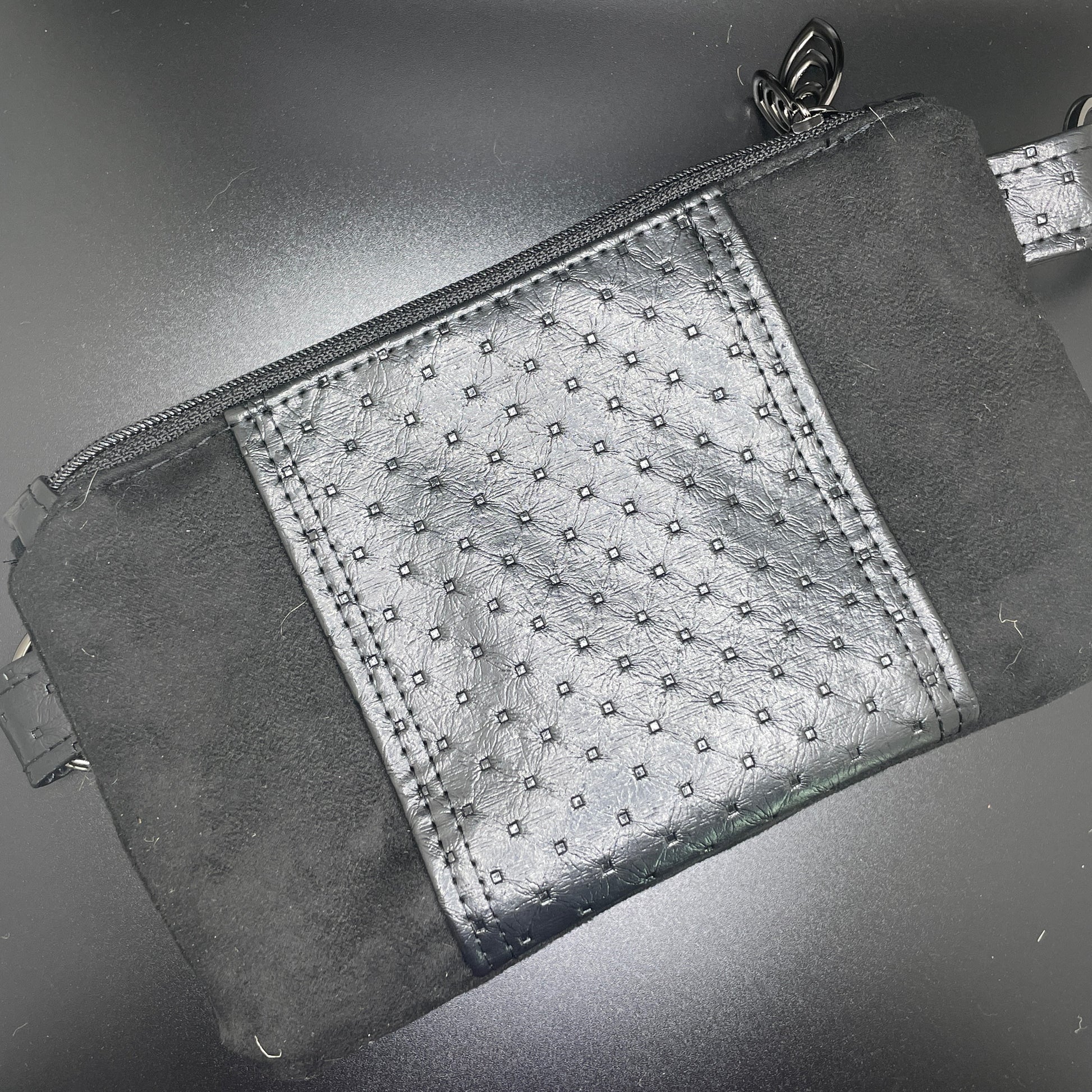 These pouches are twice the size of the Harlequin pouch with various accents and variations. Those with D-rings attached can either be used as a wrist-let or a cross-body (if there are two). Some have a side strap to make them easier to hold as a clutch. Choose the pouch you like and make sure it has the attachments that will work for you. Then add a cross-body strap or wrist strap or both or neither. The choice is yours!