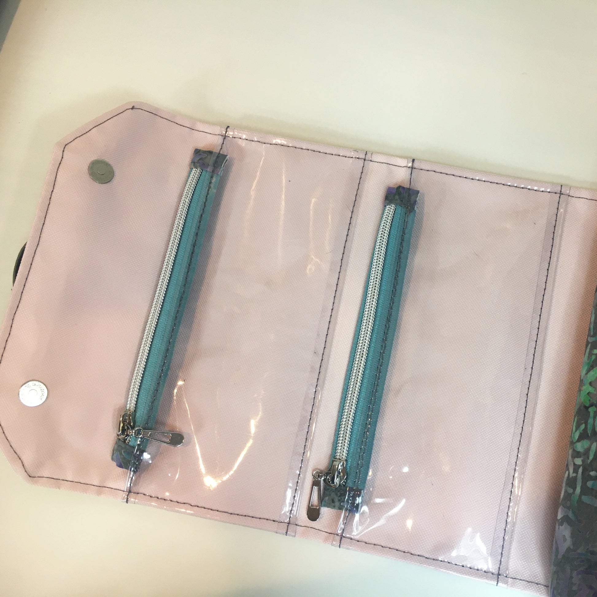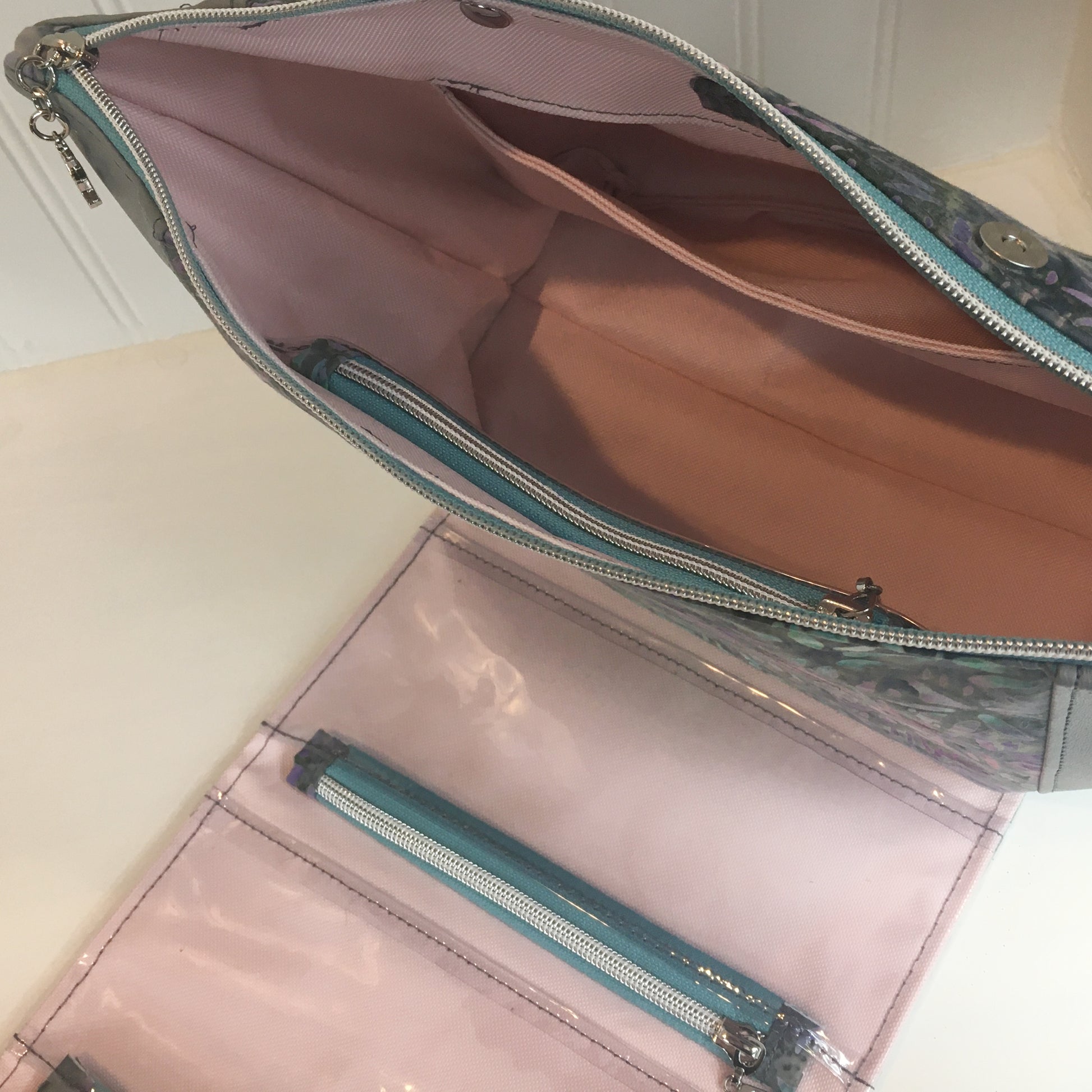 This bag measures 14.5" wide, 9" tall and 5" deep and is made from grey vinyl, flower print cotton and light pink waterproof canvas. The outer flap has 2 clear zipper pockets to help organize all your supplies and the interior of the bag itself has another clear zipper pocket and a slip pocket. The top of the bag closes with a zipper and the flap closes with two magnetic snaps