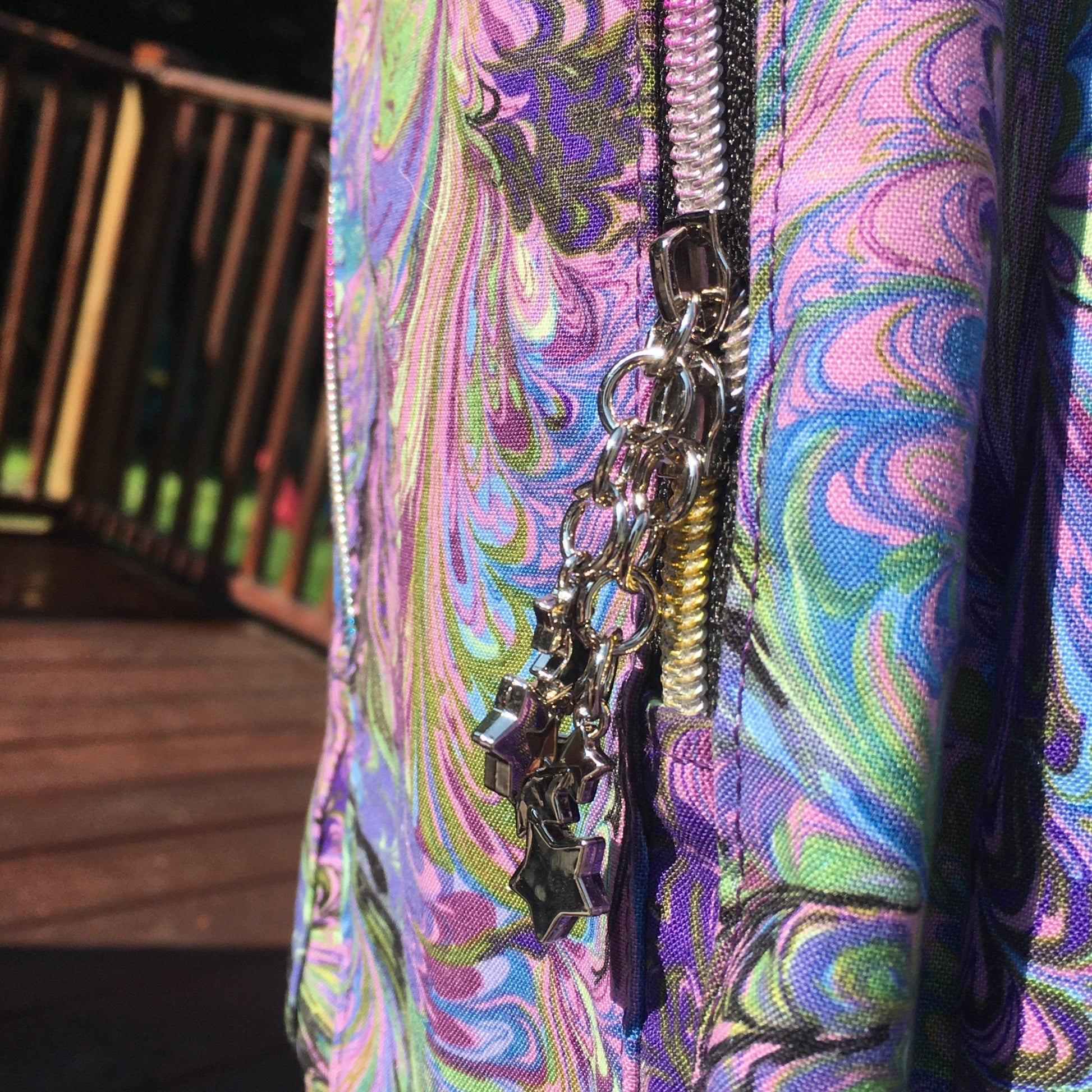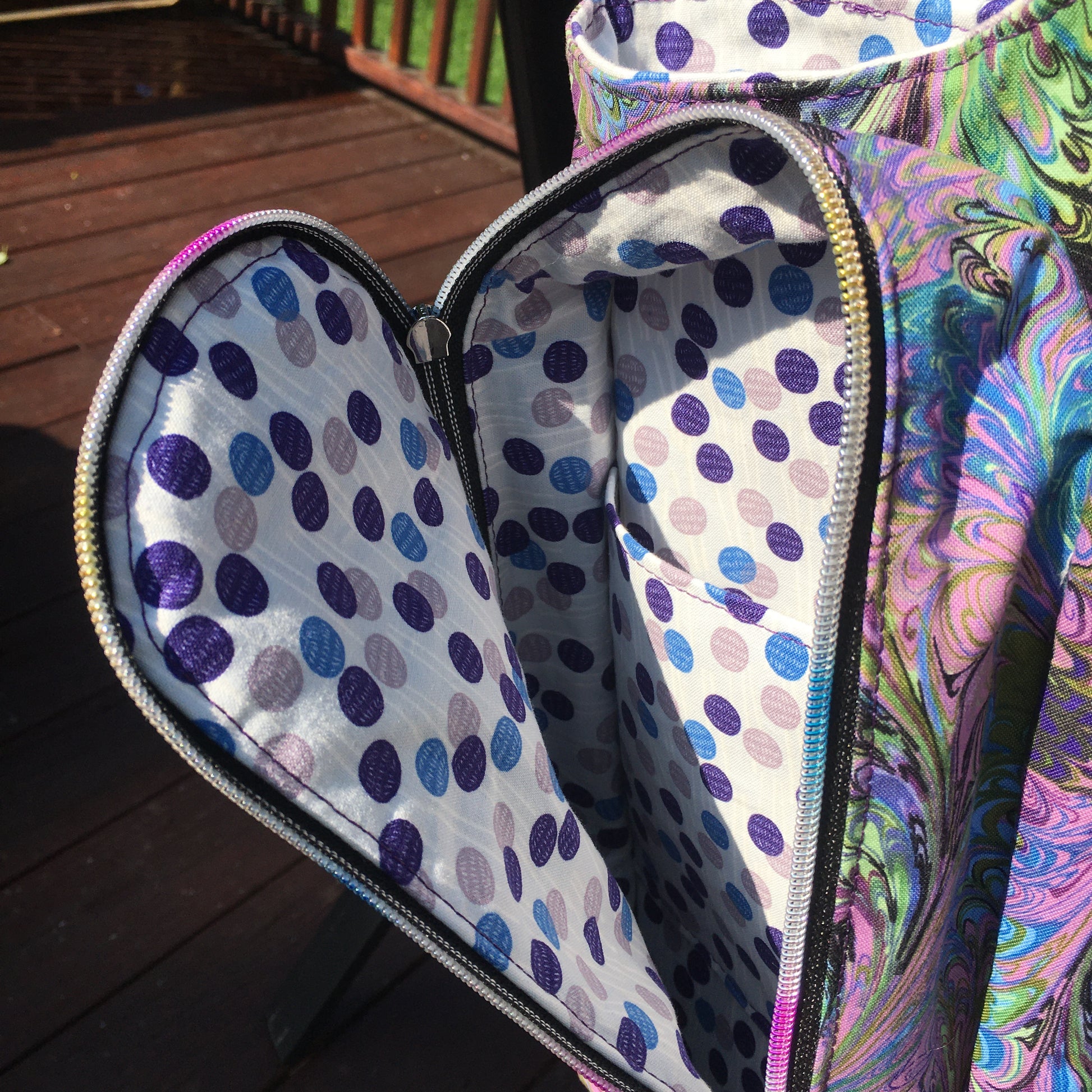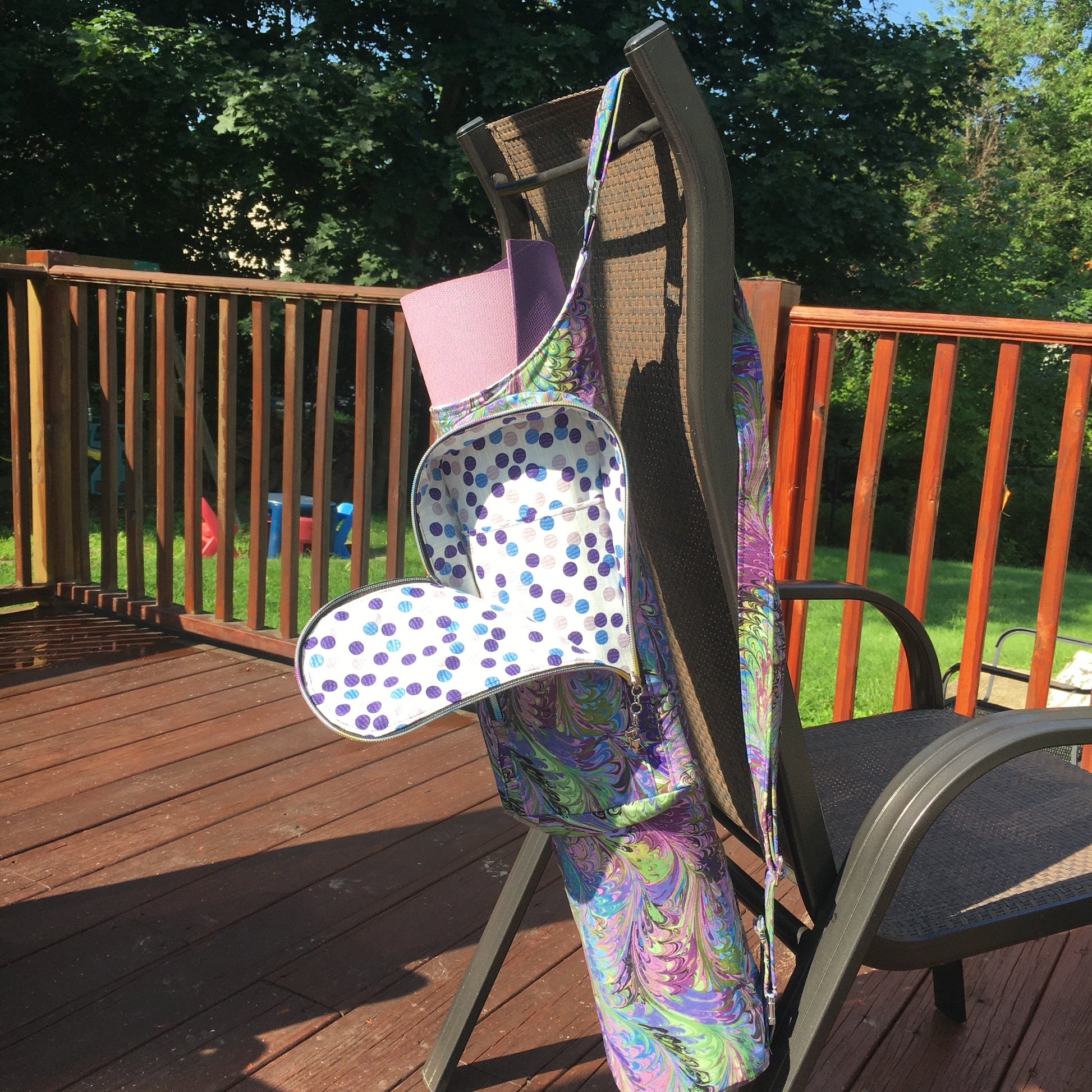 This is actually a modification of the H2O GO Sling designed by Lynd's Handmade. The body of the bag is a bit longer to accommodate a yoga mat and the strap placement has been adjusted to be comfortable with the longer body. The outside zipper pocket is just enough to be able to throw in your wallet and bring it with you to class.